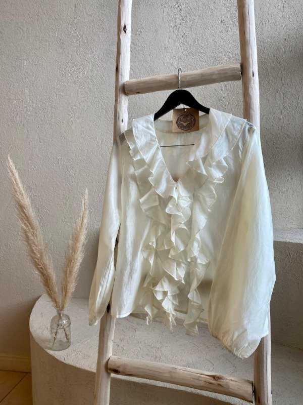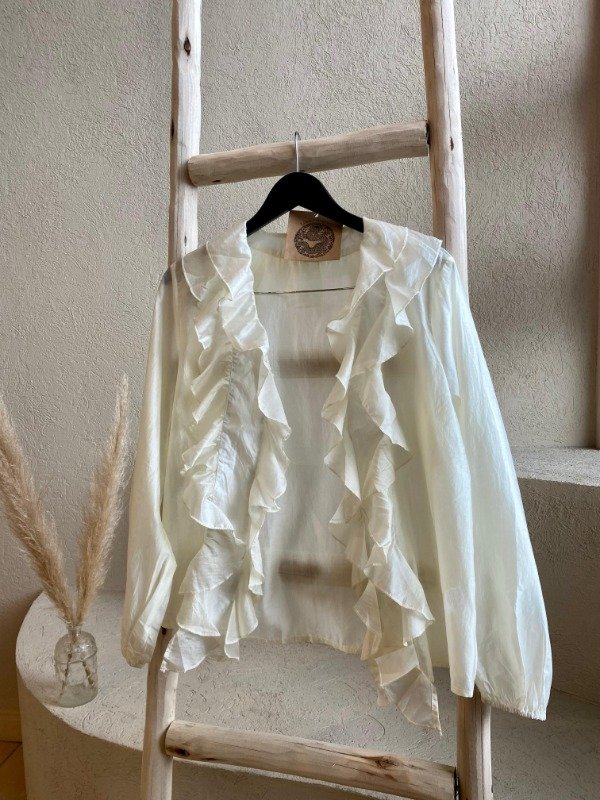 Elegancia etérea en blanco puro. Abierta o cerrada, sus volados fluidos y textura ligera te envuelven en un aire de sofisticación sutil. ¡Un toque romántico esencial! TALLE M.