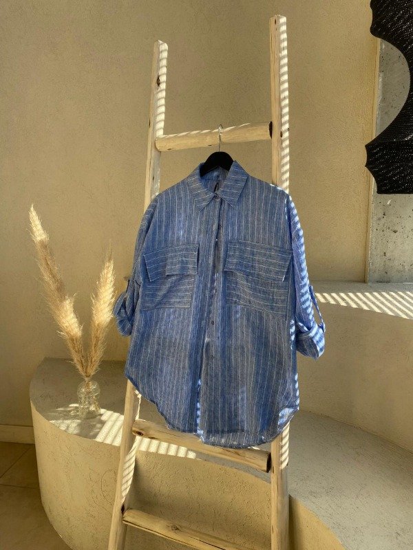 Camisa oversize a rayas azules y blancas. Con dos bolsillos frontales y mangas remangables, es ideal para un look casual y fresco. TIP: combinalo con nuestro Pantalon Summer.