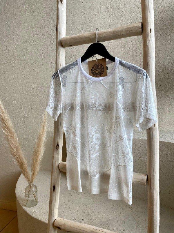 Una fusión de estilo casual y delicado. Su encaje floral transparente y corte clásico redefinen la feminidad moderna. Un toque de lujo diario. TALLE L