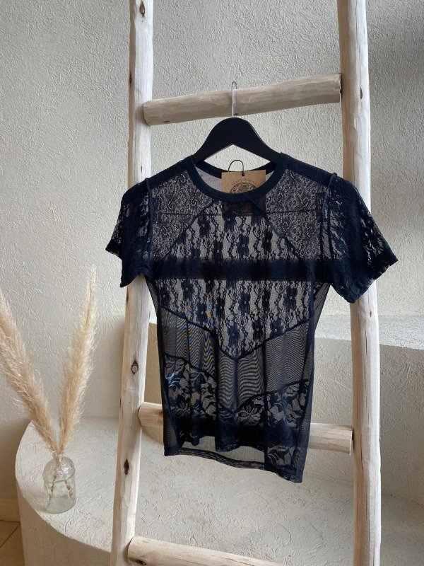 Un juego de transparencias y texturas en negro. El encaje geométrico y el diseño ajustado crean un look audaz y seductor para tus noches.TALLE S