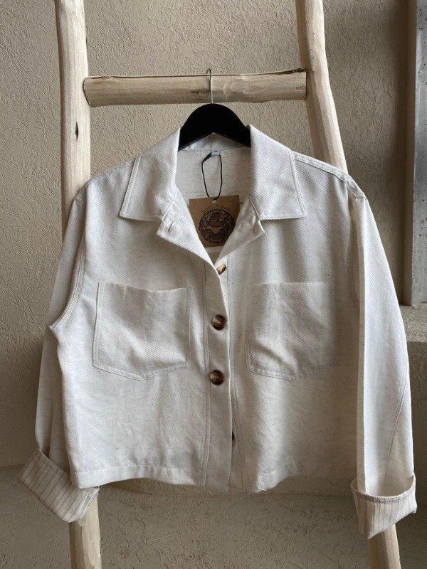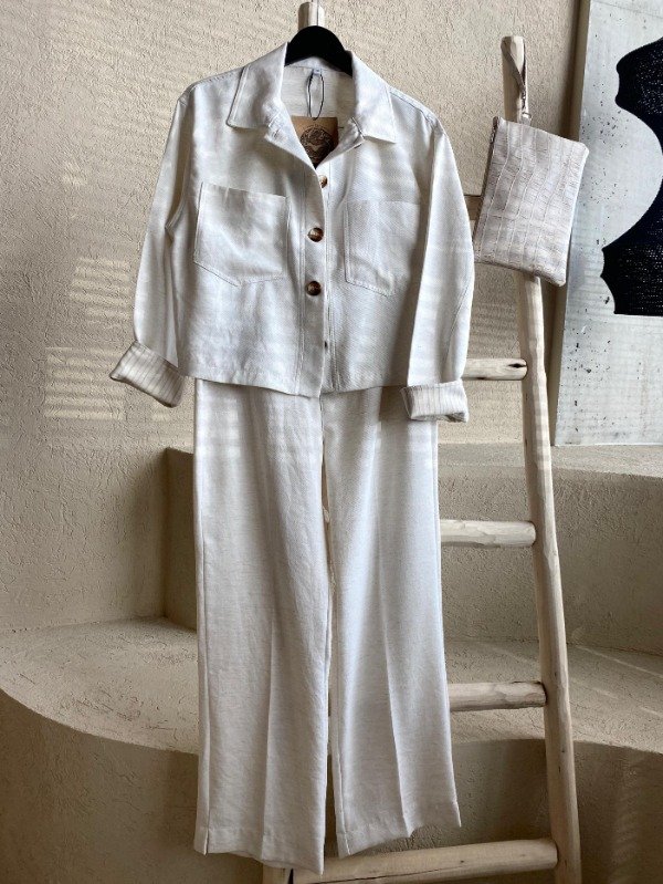 Un conjunto minimalista que combina sofisticación y practicidad.Tela rustica combinada con beige Chaqueta de corte recto con botones de madera y pantalón amplio, ideal para un look fresco y luminoso. Atemporal y versátil, perfecto para adaptarlo a tu estilo con diferentes accesorios.