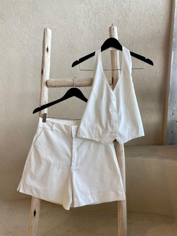 Una opcion fresca y sofisticada para el calor. El chaleco cuello V ofrece una silueta elegante y moderna. Los shorts sastreros a juego presentan un tiro alto y un corte ligeramente A-line que favorece la pierna, garantizando comodidad sin perder la formalidad. Su color neutro y la composicion liviana lo hacen perfecto para el día, la oficina o eventos de cóctel. TALLE M.