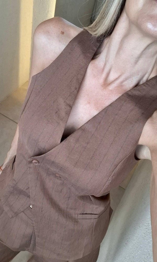 El chaleco cropped con cuello en V y botones añade un toque pulido, mientras que la espectacular espalda descubierta con tiras cruzadas y lo convierte en una pieza audaz. Los shorts sastre a juego con tiro alto y pinzas completan un look impecable. Perfecto para la oficina con stilettos o para tus noches de verano con sandalias. TALLE M.