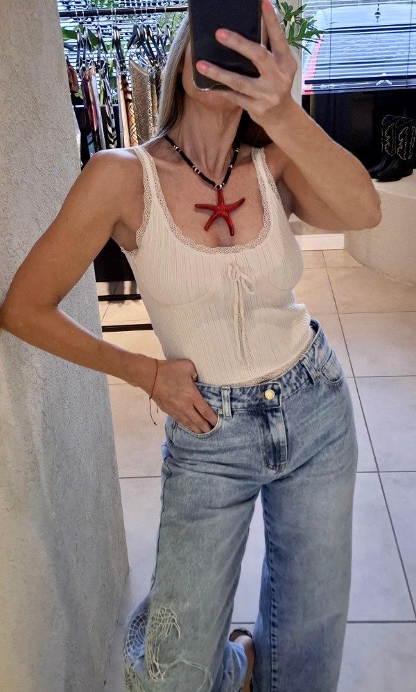 Un básico elevado, confeccionado en un suave tejido, se ajusta cómodamente al cuerpo para una silueta favorecedora. El detalle de diseño más trendy es el moño delicado combinado con el encaje. TALLE M.