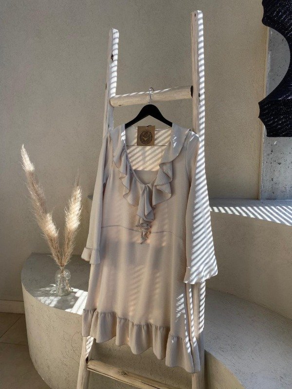 Vestido con mangas acampanadas volados delicados en el escote y el ruedo. Ideal para un look romántico y femenino.