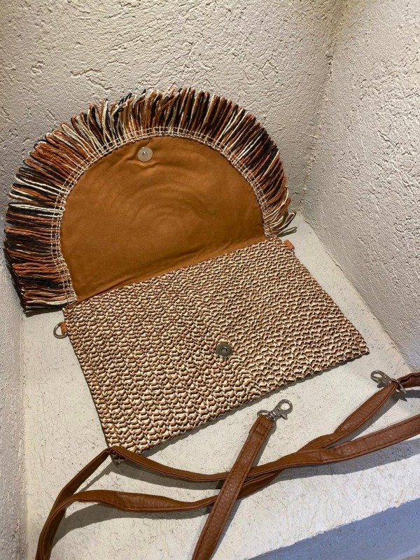 Cautivador tejido texturizado con un patrón tribal en tonos tierra, que crea una riqueza visual inmediata, los flecos gruesos añaden movimiento y un toque dramático de tendencia. Incluye una correa delgada que lo convierte de sobre de noche a bandolera de día. Con forro interior y broche magnético. 30x21cm.