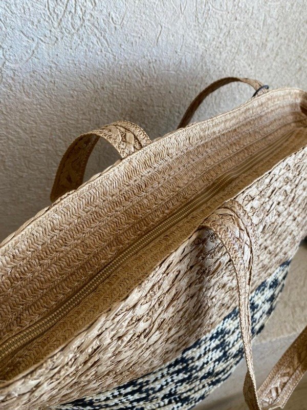 Espacioso, seguro y con un diseño de impacto, es un must-have para llevar del brunch a la playa con total elegancia. Las asas trenzadas de rafia complementan la estética. Forrado por dentro, contiene cierre y pequeño bolsillo interno. 45x33cm